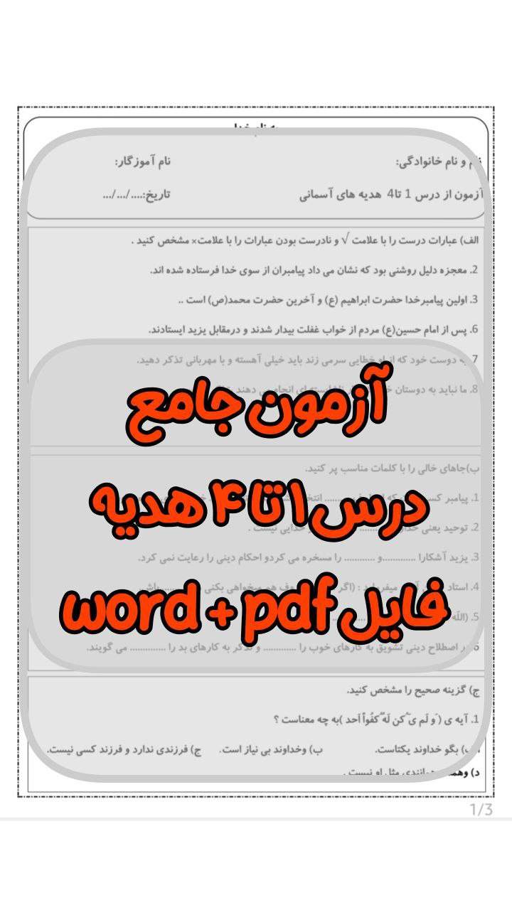 فایل word , pdf آزمون درس هدیه که شامل انواع سوالات جهت ارزشیابی